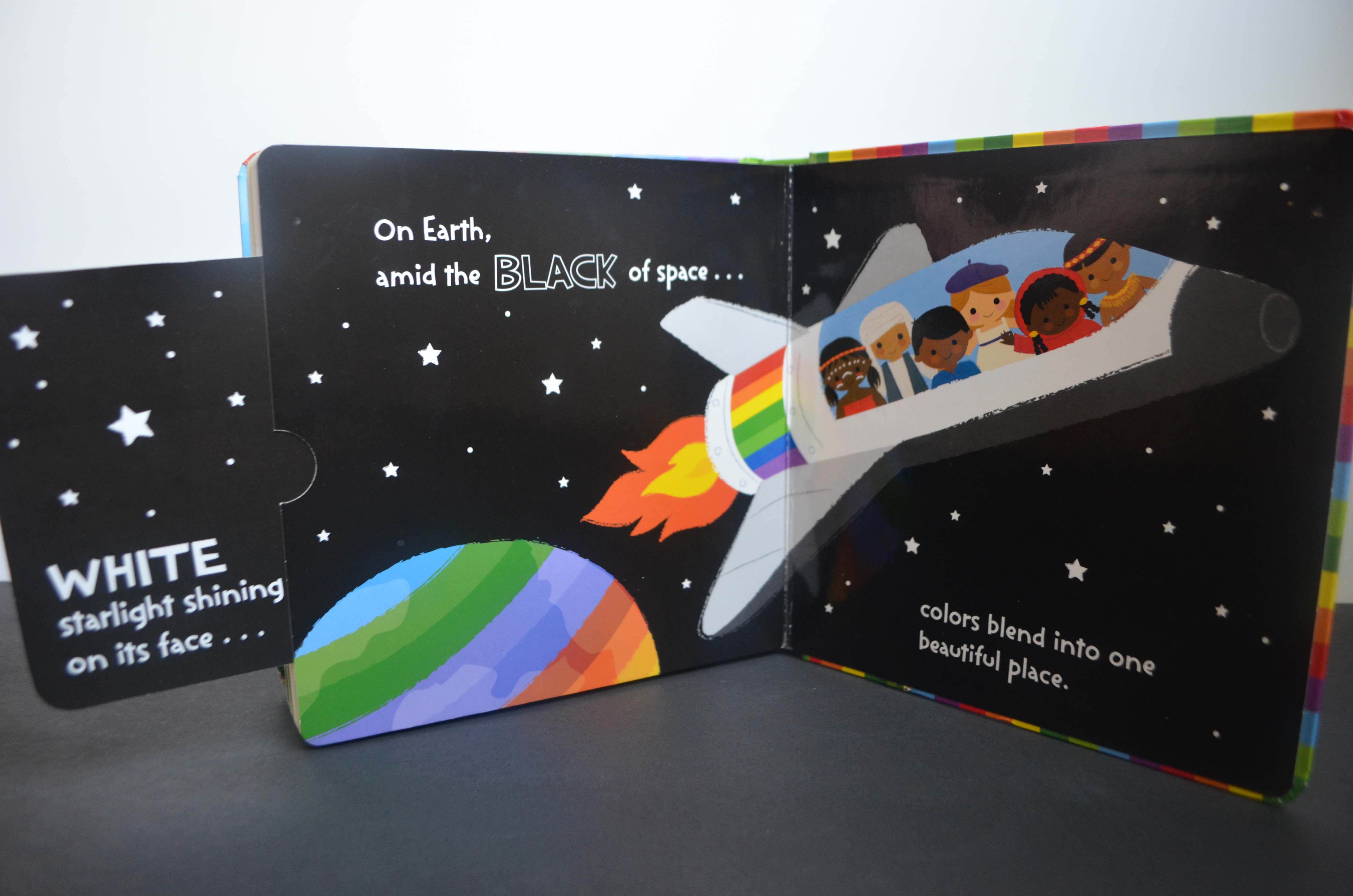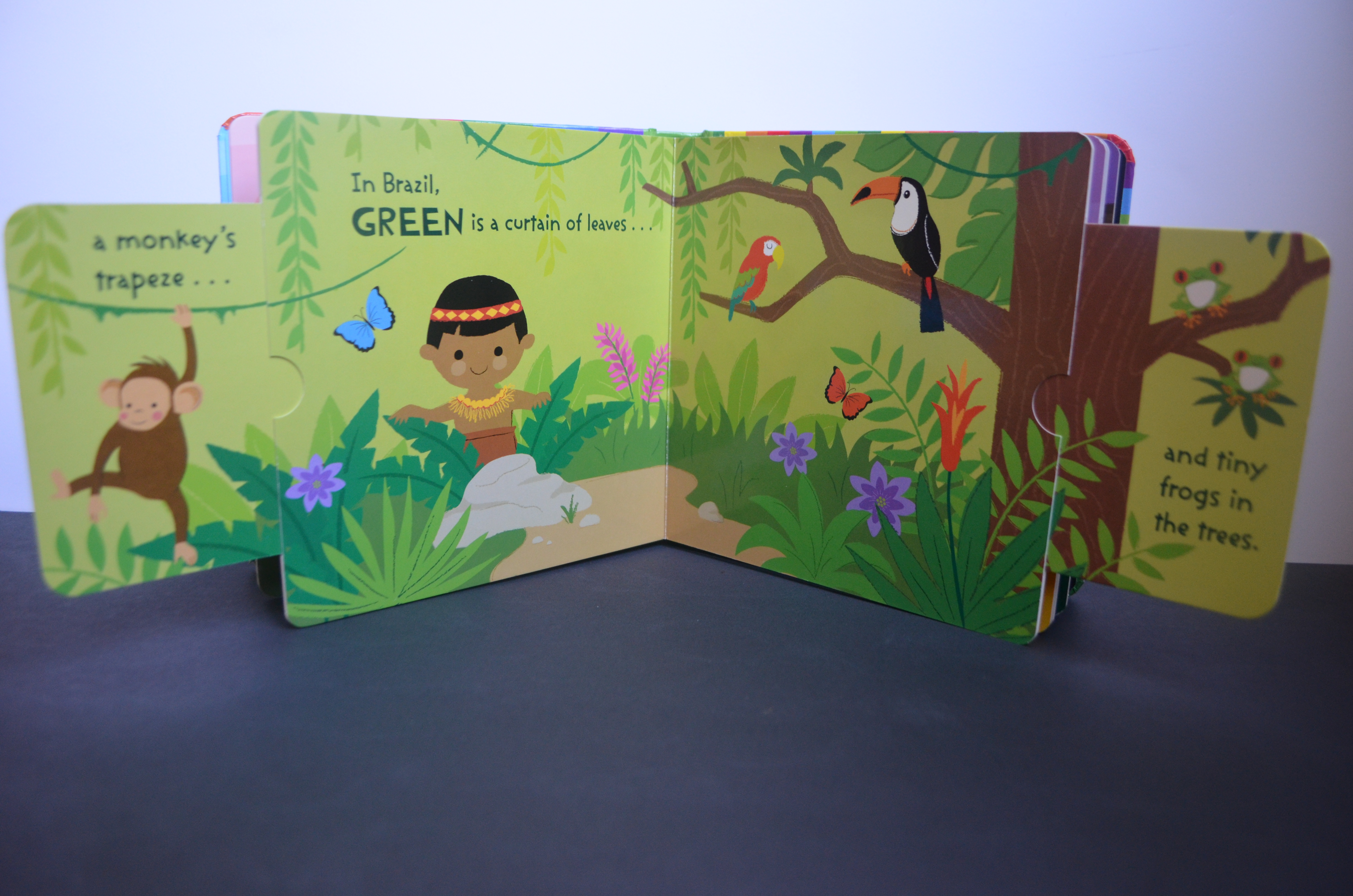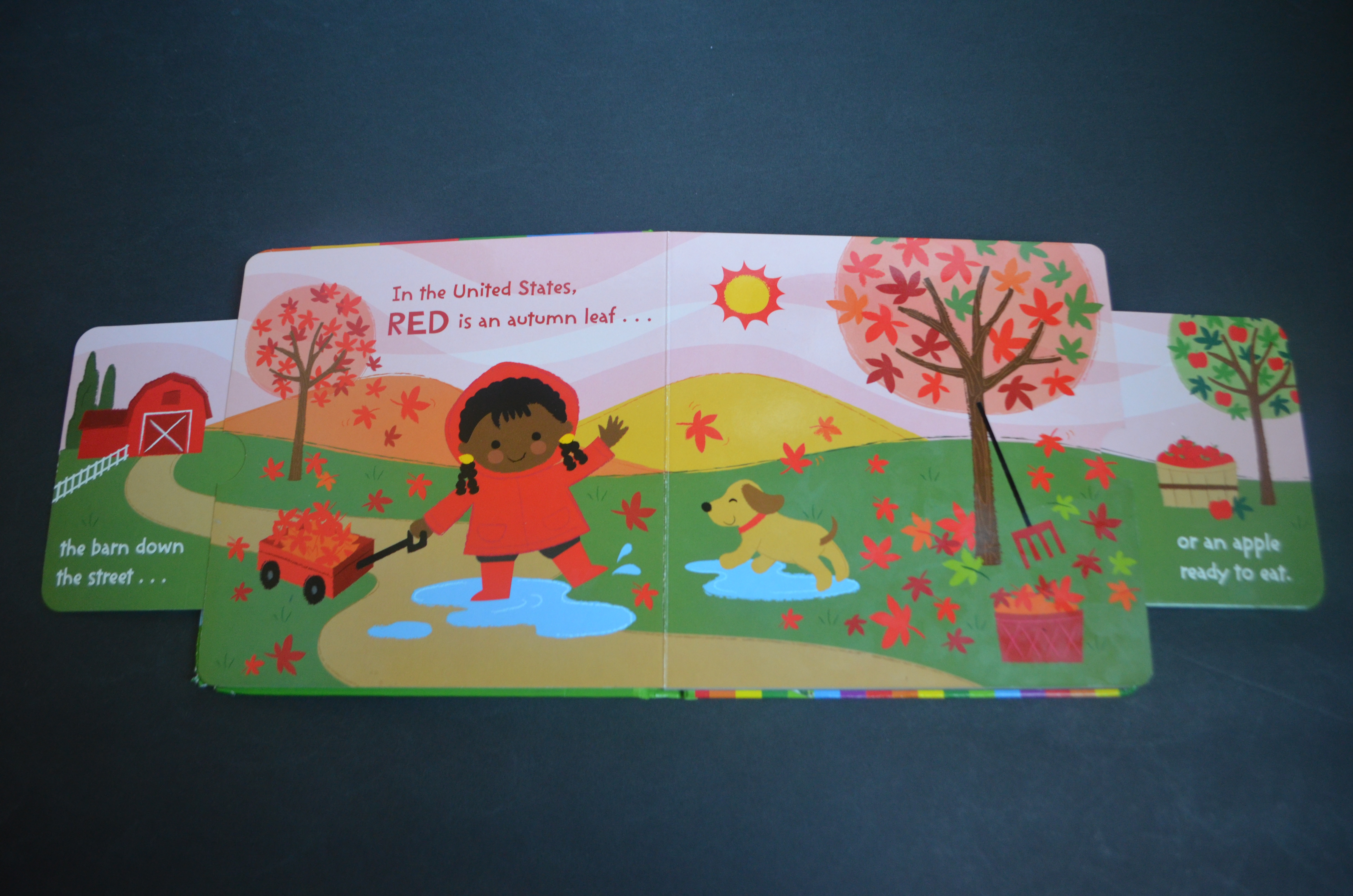 We bought this book for our son’s 1st birthday. As you can tell by the worn corner, it has been read and re-read many times. “It’s Small World:” Color Our World is a square board book. It is full of bright, full-page illustrations. It’s not a tiny board book. This one measures about 7 square inches. I was so excited about the pictures and the around-the-world themes of the book that I didn’t even notice the pullout pages until our sons started pulling them out! (Yes, even with the note on the front cover that says, “Includes colorful pullout pages!”)