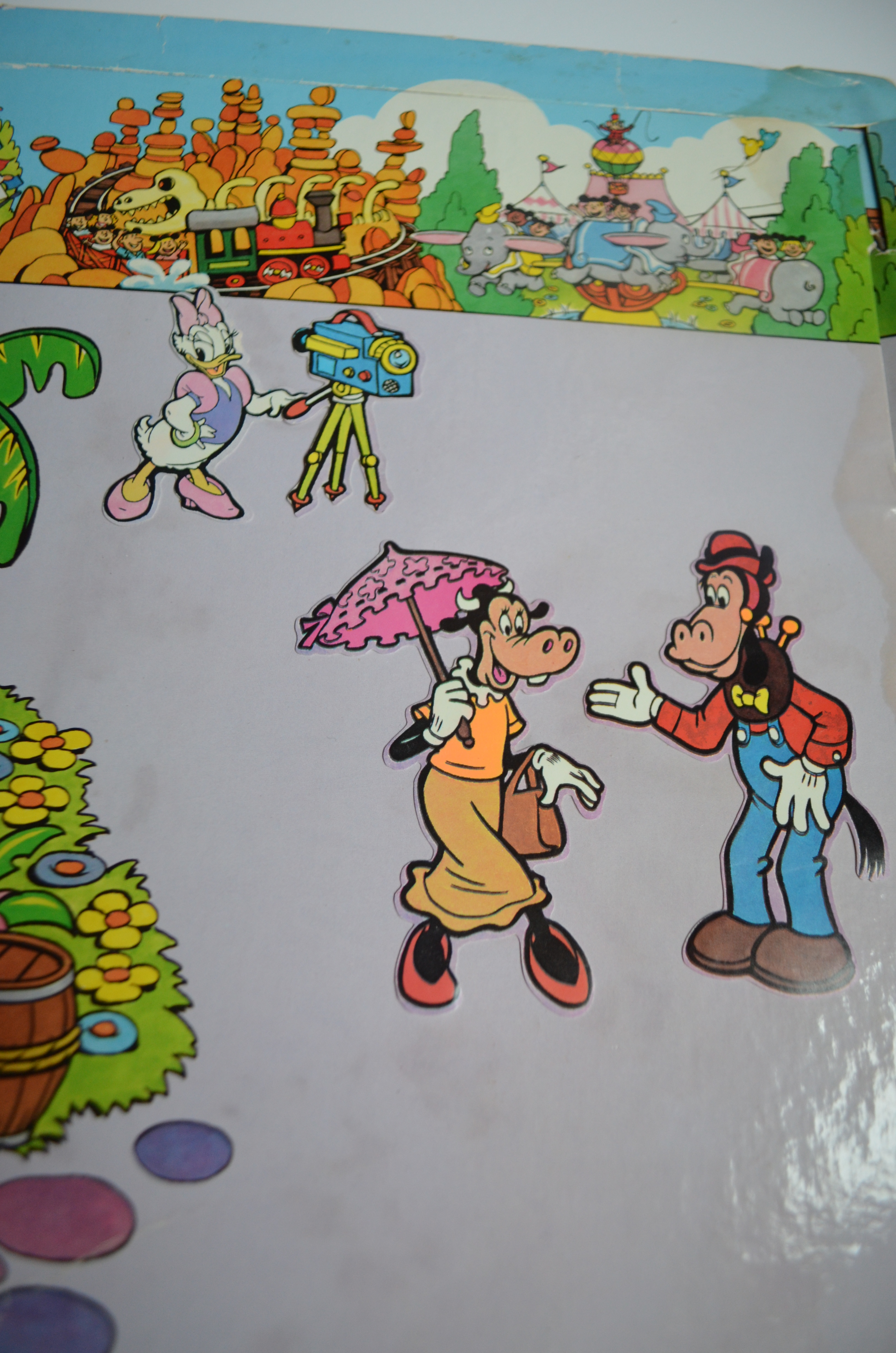 Before window clings were even a thing, Disney had these guys, who would stick to the scene. They are printed on white plastic, not clear, and are thicker than the decorations that we put on windows at holidays today.