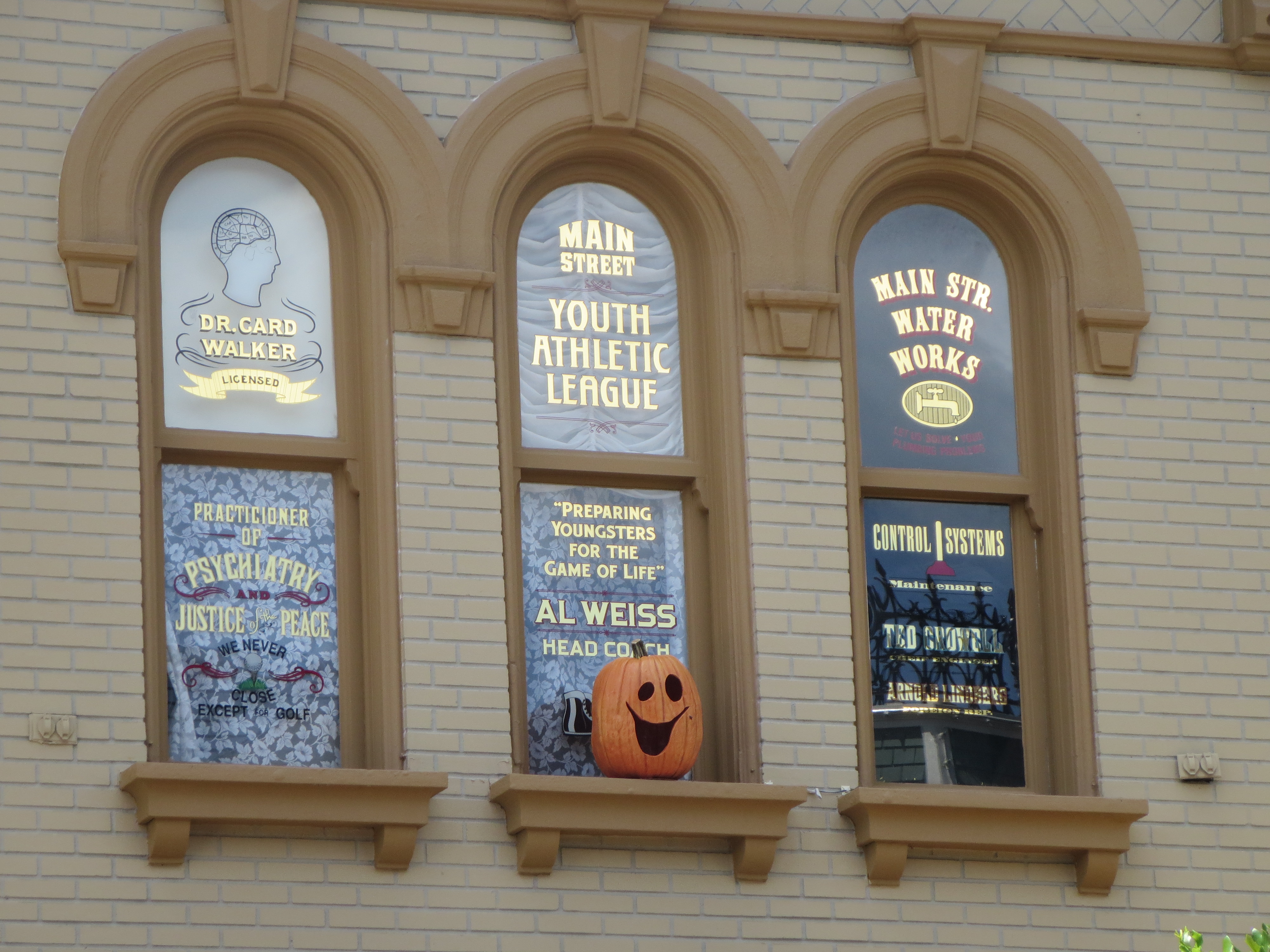As you walk along Main Street, it is fun to take the time to look up and notice the detail and hard work that went into creating each one.  The pumpkins are realistic-looking, but are actually foam. (Disney learned its lesson about using real pumpkins in Florida heat.)  Some of them reappear each year and other, new carvings are added too.  There are over 180 pumpkins on display, each one with an original design and each is carved by hand.