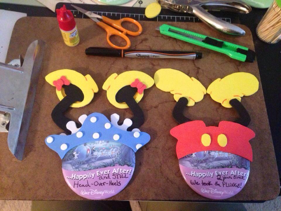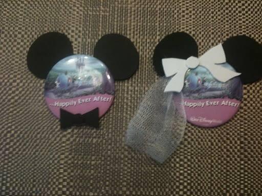What are Pin-Heads? They’re handmade, custom characters to decorate Disney’s free Celebration buttons & they’re a ton of fun to wear. I first came up with the idea when my husband, Mr. Red, and I were planning our honeymoon trip to WDW. He absolutely refused to buy or wear the Bride & Groom Ears or custom, matching shirts. I spent the week before the trip wracking my brain for something that would *stand out:* “Everyone has the buttons; that’s not interesting.” “I don’t understand why he won’t wear the ears.” “Buttons.” “Ears.”… “BUTTON EARS!” I ran to the craft store and found the perfect material: sturdy, flexible craft foam. Several hours and a few botched tries later and I had some passable mouse ears perfectly proportioned to a spare birthday button from a previous visit. Next, I sacrificed the bath loofah from my shower to make a veil. By the time I was done, my hands were more super glue than skin, but I was happy.