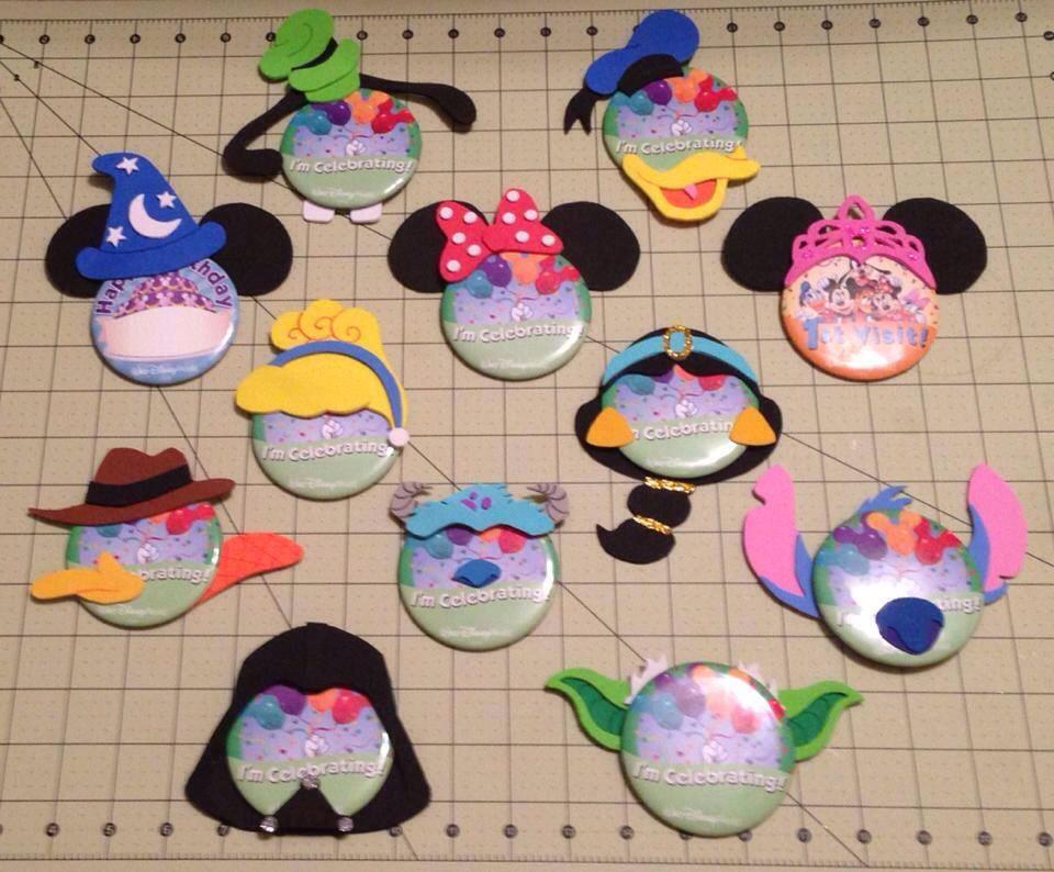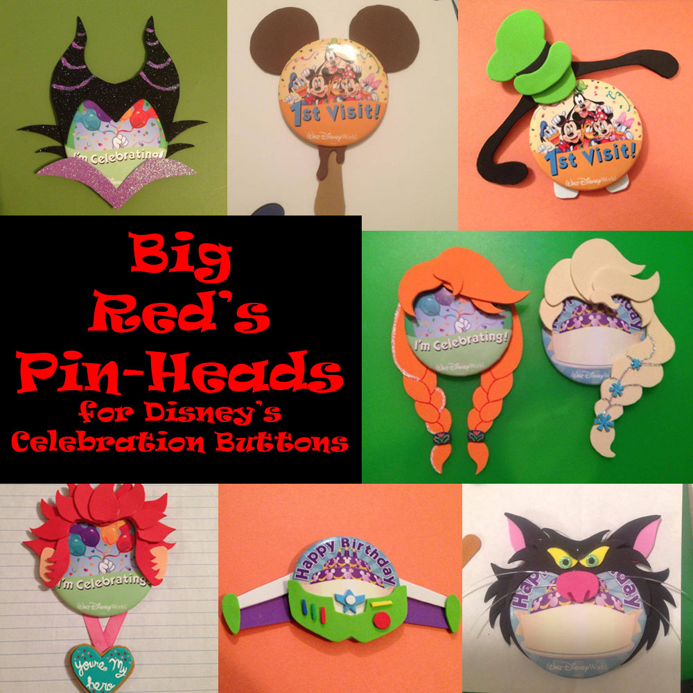 While I was browsing on Pinterest one day, I came across a pin for something I’d never seen before. They were Disney’s free buttons,* but they’d been transformed into a pirate, a bride and groom, an awareness ribbon, and even a turkey leg. The link took me to the facebook page for Big Red’s Pin-Heads, where there were tons more pictures of these things called Pin-Heads. I fell in love with them! Regretting that I hadn’t discovered these a little bit sooner (before my last vacation), I sent Big Red a message to find out more about them. She kindly got back to me and, today, we have a guest post from her about her awesome products and how we can get them.