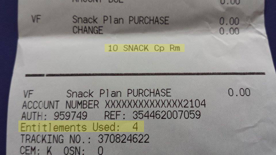 Each receipt shows the number of Quick Service Coupons Remaining and the number of Entitlements used in that transaction
